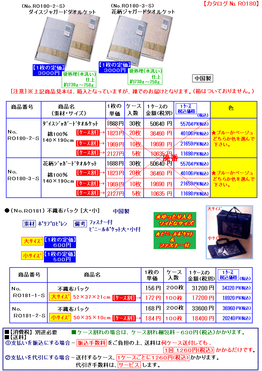 | ※[ ご注意/変更箇所 ] [北海道と離島と沖縄のみ。] 運賃高騰の為、北海道/北海道の離島/(本州・四国・九州)の離島/沖縄のみ送料が変わります。 ※上記以外の本州・四国・九州は今まで通り、1260円(税込)です。 @振込みにしても、送料が右記価格で、1ケースごとにかかります。 北海道--2350円(税込) 北海道の離島--2900円(税込) (本州・四国・九州)の離島--1850円(税込) 沖縄--2970円(税込) A代引きの場合は、北海道/北海道の離島/本州・四国・九州の離島/沖縄につきまして、上記送料以外に代引料が1ケースにつき、420円(税込)かかります。 ※離島と沖縄のみ、元々1ケースの荷物でもサイズ・重量により複数ケース扱いになることもございます。 また、近年、橋が通った場合も、運送会社の規定により離島扱いとなります。 |