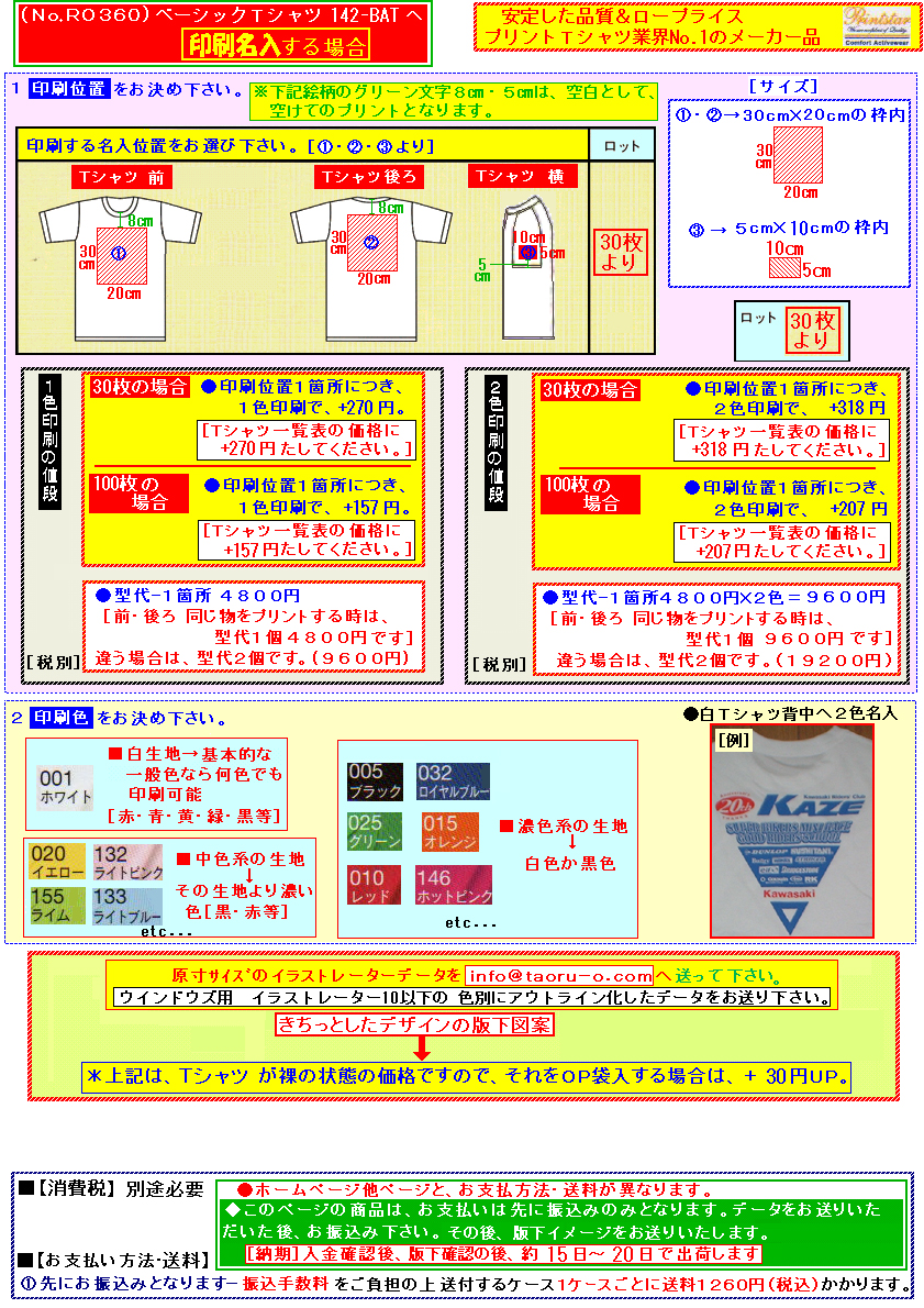 ●カラーTシャツ18色ページへ ●激安白Tシャツページへ [●拡大 名入れ見本(例) ページへ] [●名入するインク色ページへ]
