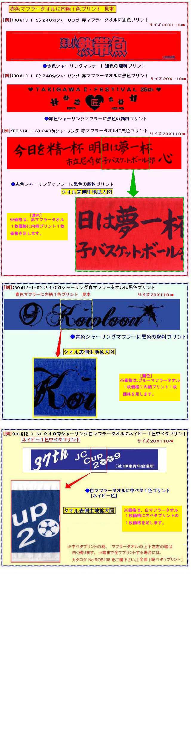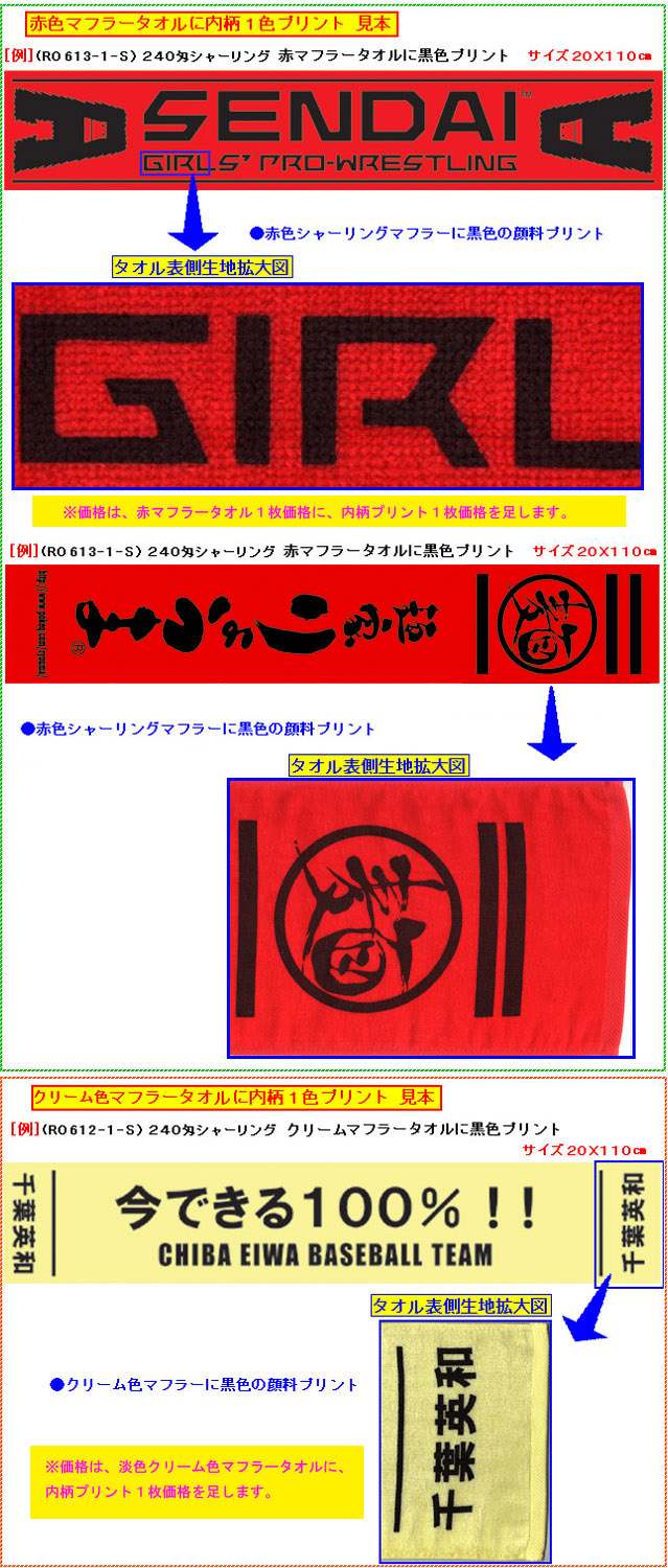 [●人気の赤マフラーに黒1色名入れして1枚165.5円/クリームマフラーなら1枚159.3円]