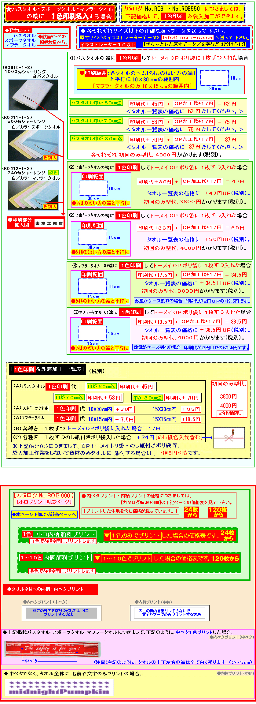 | ■[ご注文方法](片袖印刷/両袖印刷の場合) @各生地ページ下部の注文画面より、商品番号・商品名・枚数・金額をご記入いただき、ご注文下さい。その時に必ず、備考欄にデザインデータ別途送付とご記入下さい。 A次に商品タイプが決まりましたら、[指定ロゴやマーク・キャラクターがある場合には] 生地サイズに併せた原寸イライトレーター10 色別アウトラインデータを info@taoru-o.com へ送付してください。 ■文字と数字のみの場合は、下記のワード用テンプレートにて、デザイン作成可能です。該当するものをダウンロードいただき、作成後、送付ください。 ◆フェイスタオル34X85pテンプレート ◆マフラータオル20X110pテンプレート ◆スポーツタオル40X110pテンプレート ◆バスタオル62X120pテンプレート ◆バスタオル70X130pテンプレート ◆ハンドタオル34X38pテンプレート |