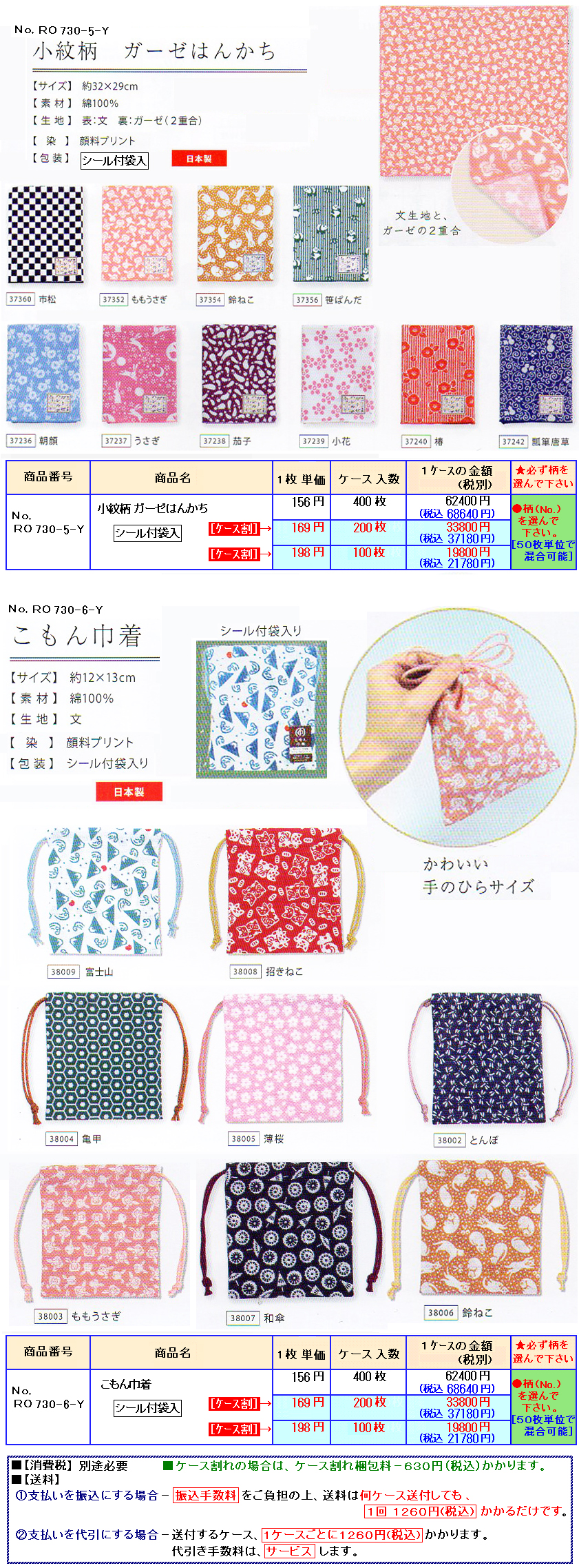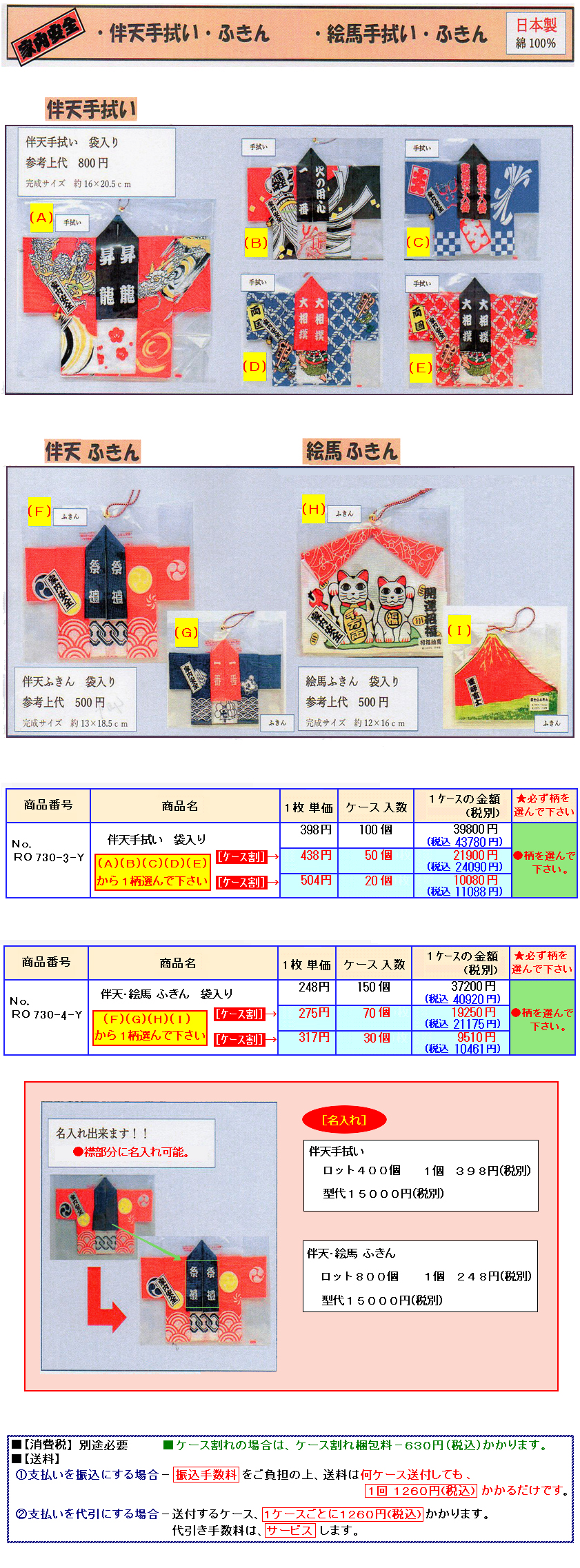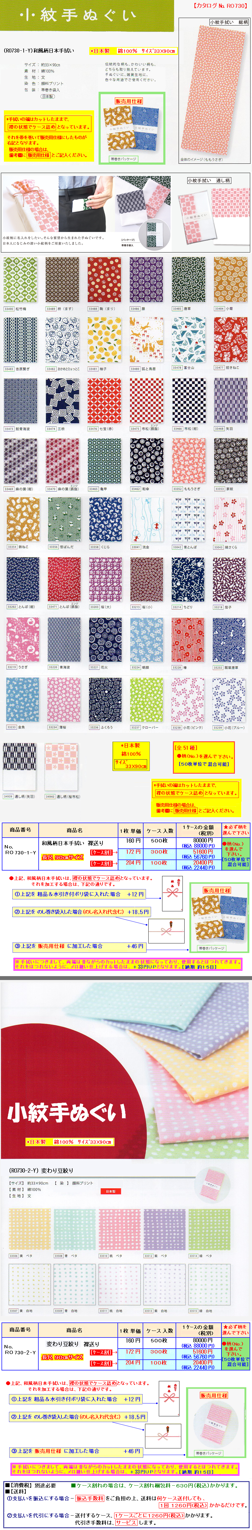 ◆下記(RO730-1-Y)和風柄日本手拭いへの名入れは、カタログNo.RO760のシャーリング白タオルの端への名入れと同じ要領