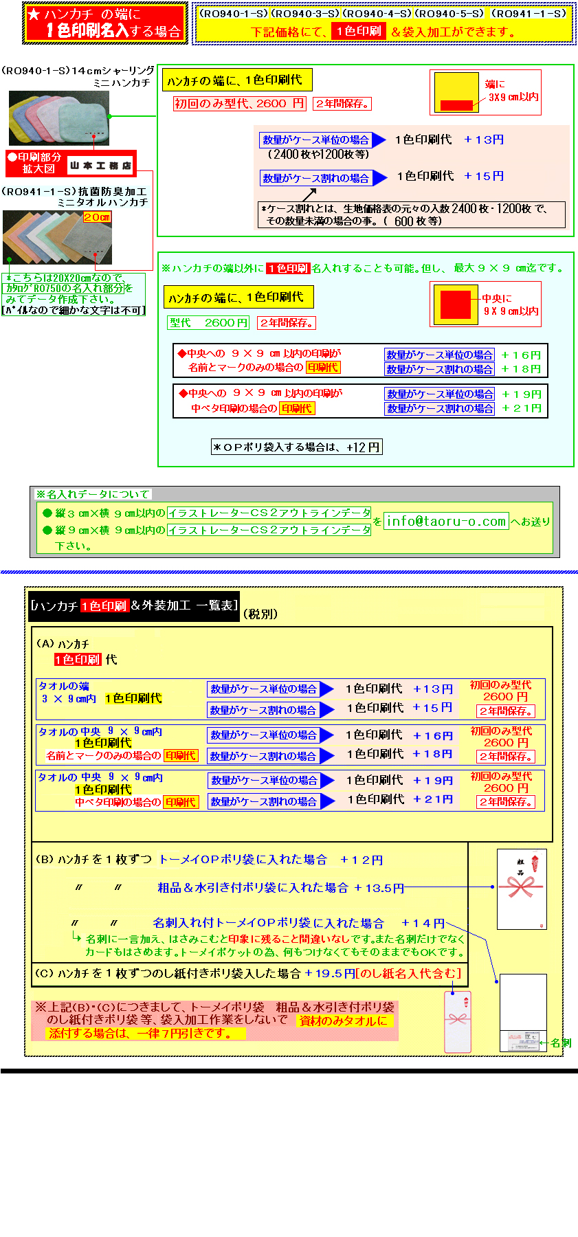 | ■[ご注文方法](端へ1色印刷/中央へ1色印刷の場合) @各生地ページ下部の注文画面より、商品番号・商品名・枚数・金額をご記入いただき、ご注文下さい。その時に必ず、備考欄にデザインデータ別途送付とご記入下さい。 A次に商品タイプが決まりましたら、[指定ロゴやマーク・キャラクターがある場合には] 生地サイズに併せた原寸イライトレーター10 色別アウトラインデータを info@taoru-o.com へ送付してください。 ■文字と数字のみの場合は、下記のワード用テンプレートにて、デザイン作成可能です。該当するものをダウンロードいただき、作成後、送付ください。 ◆タオルハンカチ20X20p(7X15p名入)テンプレート ◆タオルハンカチ20X20p(15X15p名入)テンプレート ◆タオルハンカチ25X25p(7X15p名入)テンプレート ◆タオルハンカチ25X25p(15X15p名入)テンプレート ◆タオルハンカチ14X14p(9X9p名入)テンプレート |