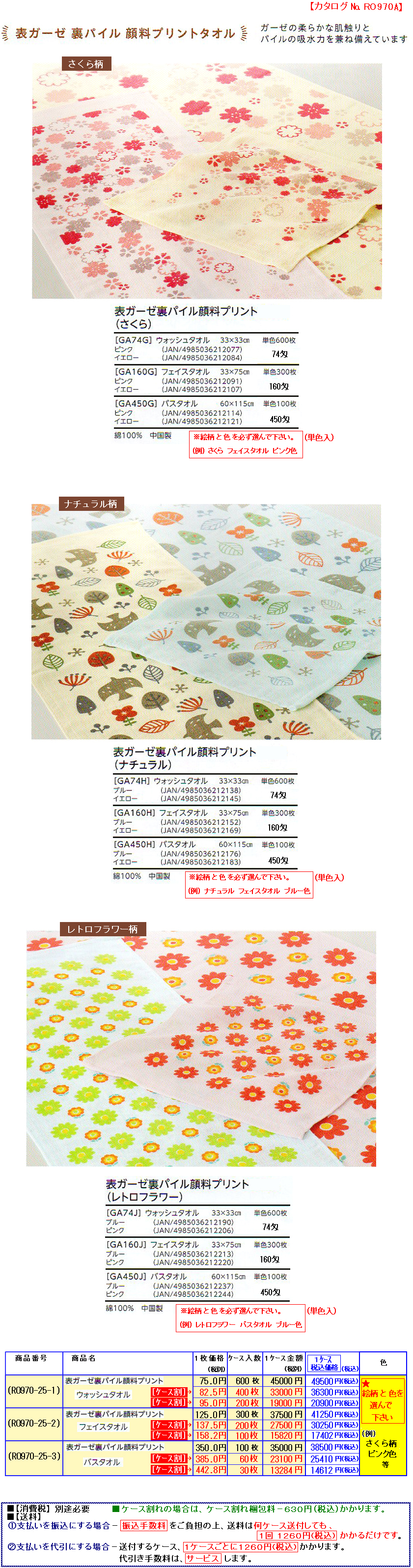 | ◆下記(RO970-4・5・6・11-S)表ガーゼ裏無撚糸・パイル タオルへの名入れは、カタログNo.RO760のシャーリング白タオルの端への名入れと同じ要領ですので、そちらをご覧下さい。[プリント柄の上からタオルの端へ濃色にて名入(+13.5円)/ロット各ケース割れロット以上]] |