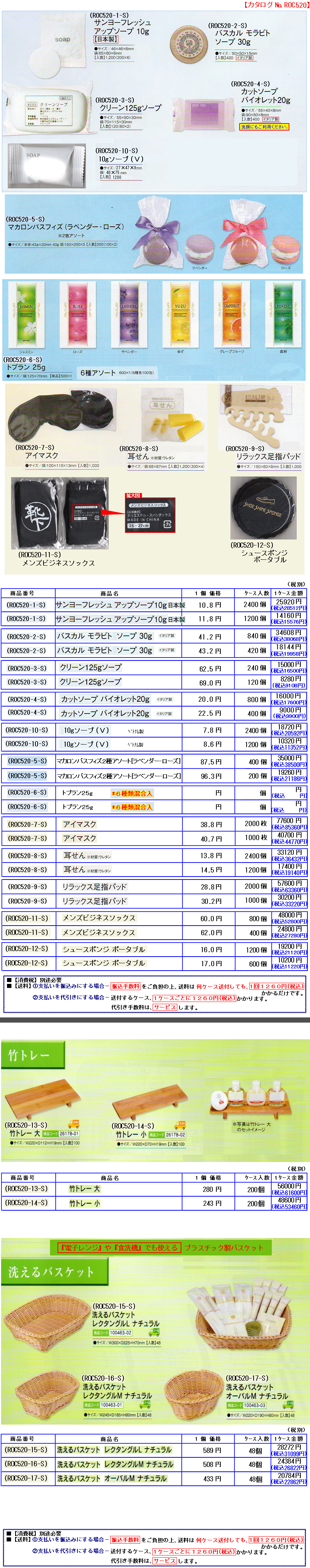 歯ブラシセット10.3円/カミソリ11.5円/ヘアーバンド6.6円/コーム8.6円コットンセット8.3円/シャワーキャップ8.5円/リンスインシャンプー12.3円/ソープ10.7円/ヘアーブラシ16.5円[業務用]