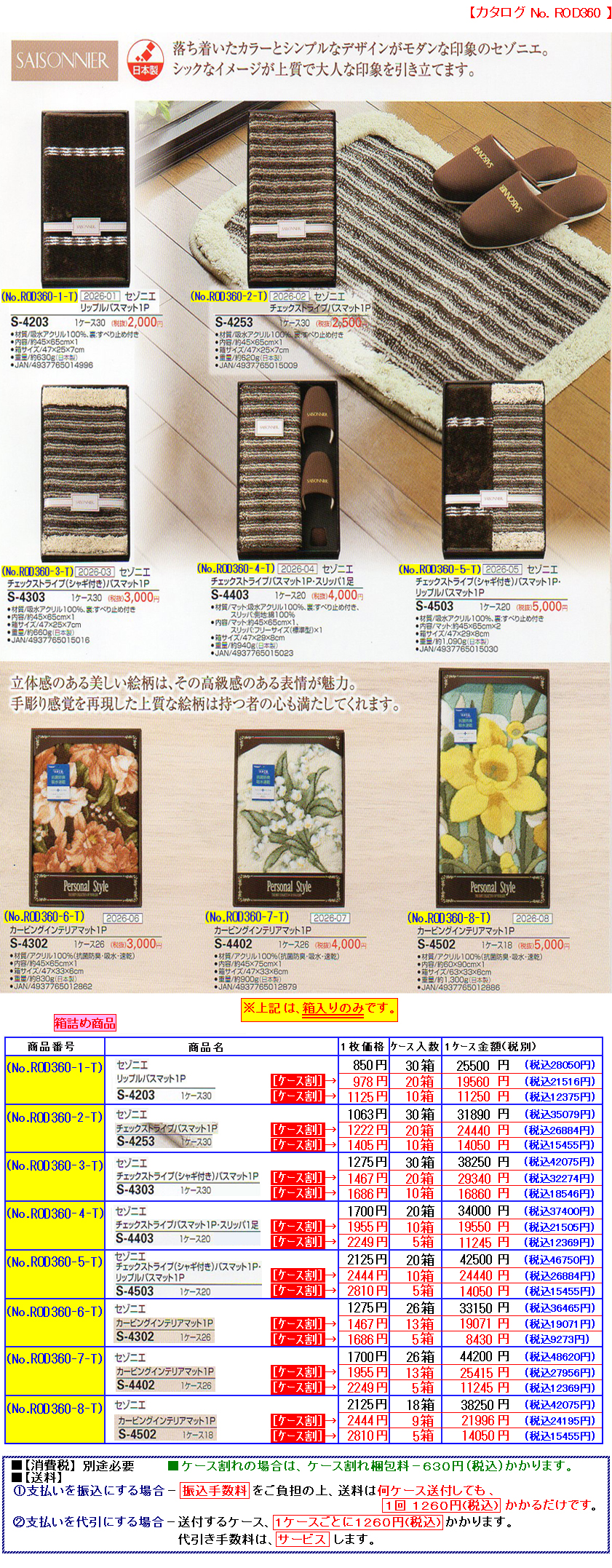 | ※[ ご注意/変更箇所 ] [北海道と離島と沖縄のみ。] 運賃高騰の為、北海道/北海道の離島/(本州・四国・九州)の離島/沖縄のみ送料が変わります。 @振込みにしても、送料が右記価格で、1ケースごとにかかります。 北海道--2350円(税込) 北海道の離島--2900円(税込) (本州・四国・九州)の離島--1850円(税込) 沖縄--2970円(税込) A代引きの場合は、北海道/北海道の離島/本州・四国・九州の離島/沖縄につきまして、上記送料以外に代引料が1ケースにつき、420円(税込)かかります。 ※離島と沖縄のみ、元々1ケースの荷物でもサイズ・重量により複数ケース扱いになることもございます。 また、近年、橋が通った場合も、運送会社の規定により離島扱いとなります。 ※上記以外の本州・四国・九州は今まで通り、1260円(税込)です。 |