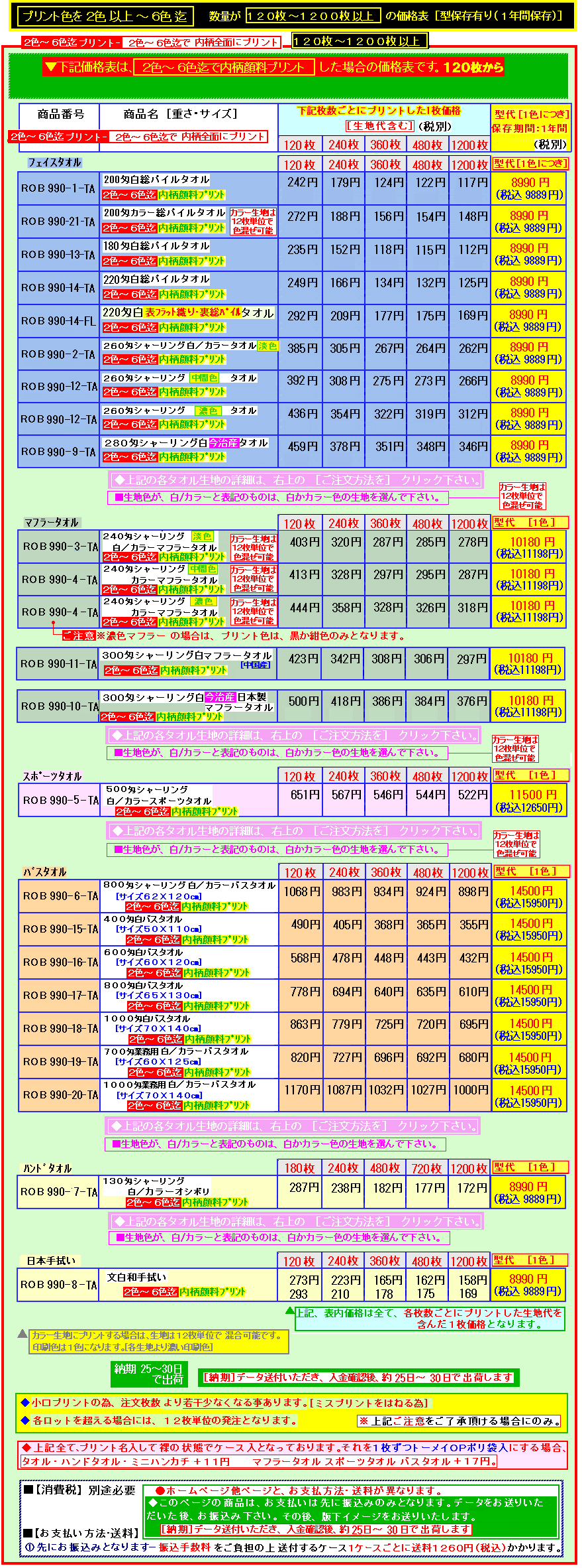 | ■[ご注文方法]小口内柄顔料プリント @本ページ下記の注文画面より、下記の商品番号・商品名・枚数・金額をご記入いただき、ご注文下さい。その時に必ず、備考欄にデザインデータ別途送付とご記入下さい。 A次に商品タイプが決まりましたら、下記デザイン作成の注意点をご覧いただき、生地サイズに併せた原寸イライトレーター10 色別アウトラインデータを info@taoru-o.com へ送付してください。 ◆各生地サイズに対し、両ヘムから5cmずつ両ミミから2cmずつ余白を残した枠内へデザイン作成下さい。 ■文字と数字のみの場合は、下記のワード用テンプレートにて、デザイン作成可能です。該当するものをダウンロードいただき、作成後、送付ください。 ◆フェイスタオル34X80pテンプレート ◆フェイスタオル34X85pテンプレート ◆マフラータオル20X110pテンプレート ◆スポーツタオル34X110pテンプレート ◆スポーツタオル40X110pテンプレート ◆バスタオル60X120pテンプレート ◆バスタオル62X120pテンプレート ◆バスタオル70X130pテンプレート ◆手拭い33X90pテンプレート |